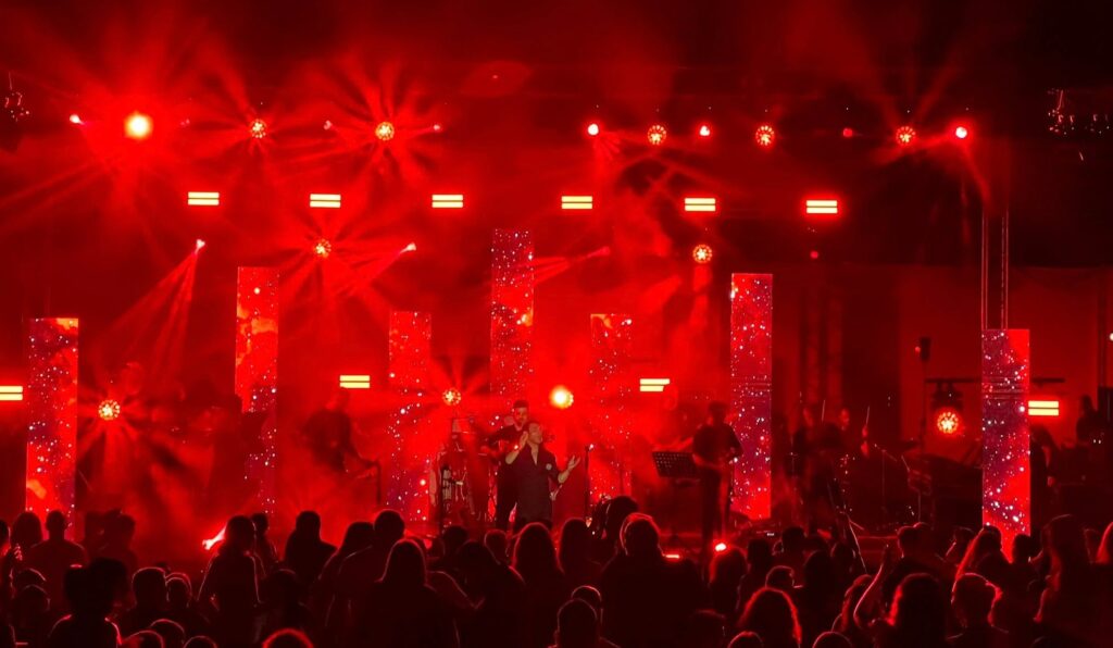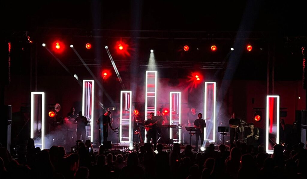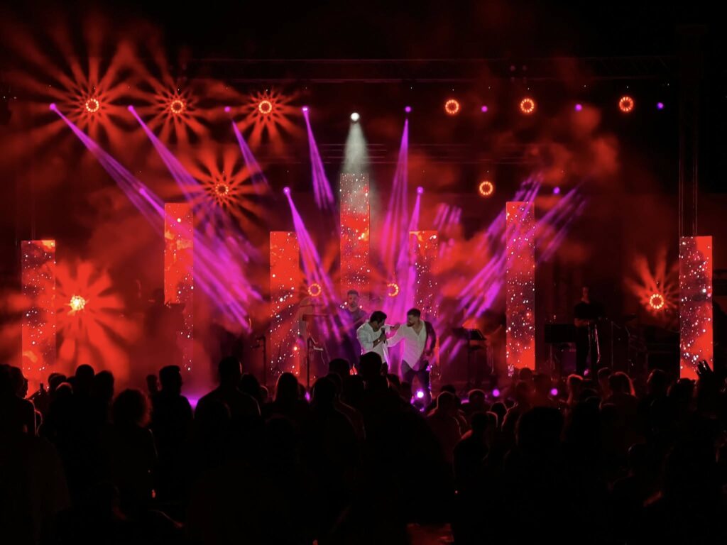 “My intention was to enrich the overall setup by adding LED screen columns and playing with both the height and the depth of the stage,” said Konstantinos, who configured his stage on three levels that had half-meter columns varying in height (1.6, 1.8 and 2 meters).