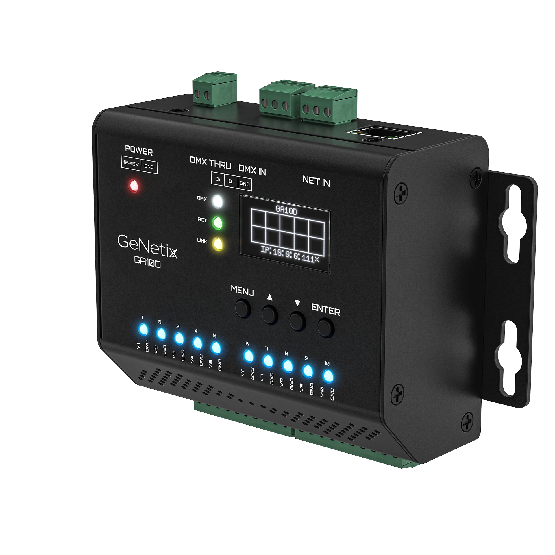 GeNetix GA10D is a DIN rail mountable 10-Port DMX/Art-Net/sACN to Analog 0-10V Converter fitted with phoenix screw terminals for DMX in/through and 0-10V out from terminal block connectors, offering a design ideally suited to the needs of permanent installations. GA10D is powered via an external 12-48V power supply (purchased separately) and features an onboard menu display with push button navigation for unit configuration, along with LEDs that provide visual indication of output port status.